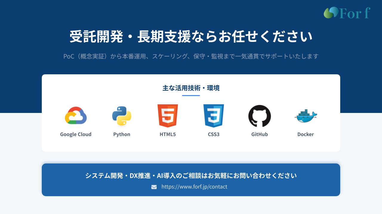 このようなお悩みをお持ちの企業様は、ぜひ一度ご相談ください。要件整理から設計・開発・運用まで、一貫してサポートいたします。