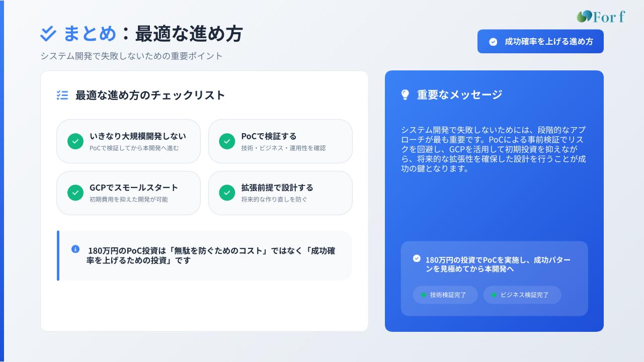 特に、180万円前後のPoC投資は「無駄を防ぐためのコスト」ではなく「成功確率を上げるための投資」です。