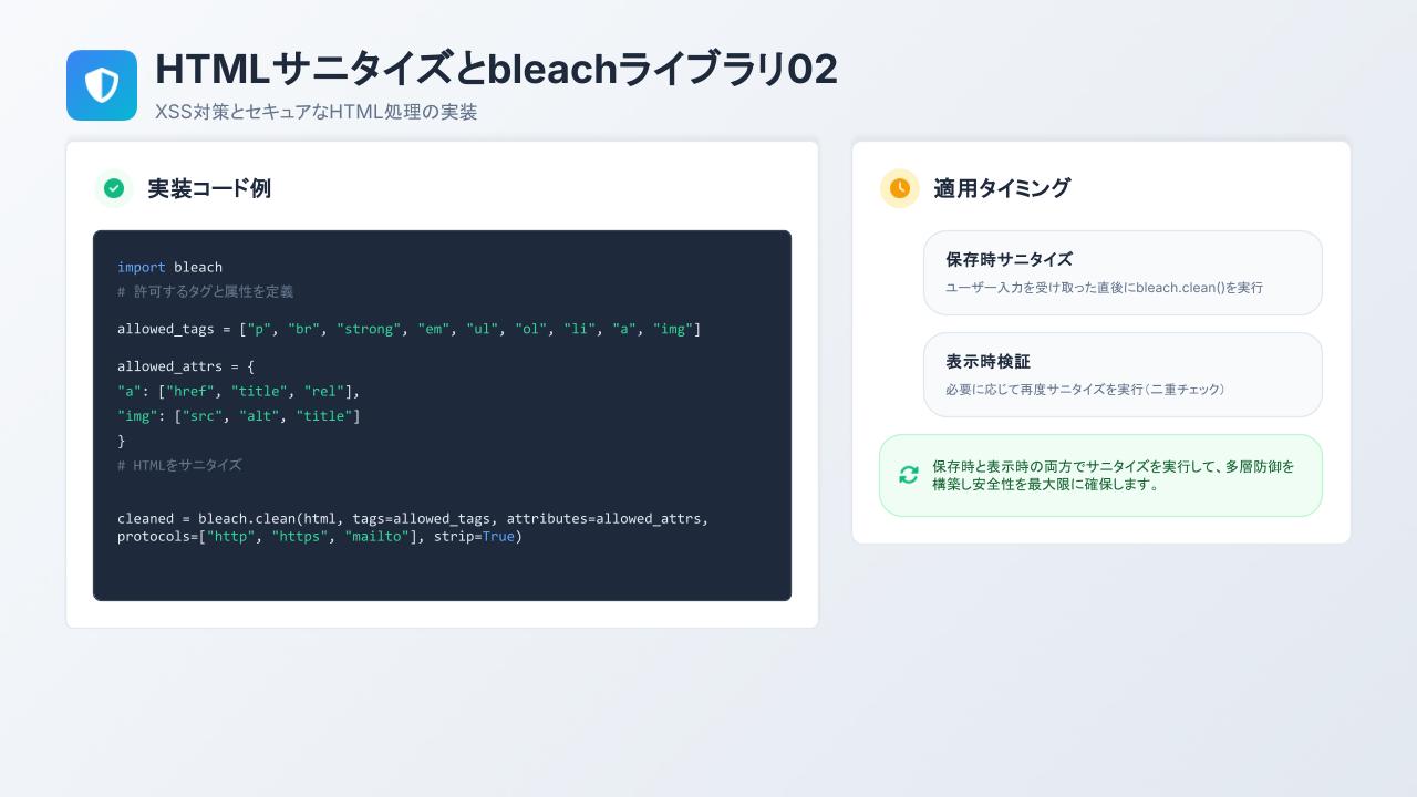 また、保存時と表示時の両方でサニタイズ処理を行うことで、多層的な防御を実現しています。