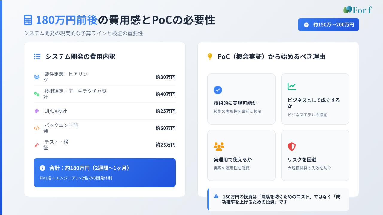 そのため、180万円前後の投資でPoCを実施し、成功パターンを見極めてから本開発へ進むという流れが最も合理的です。